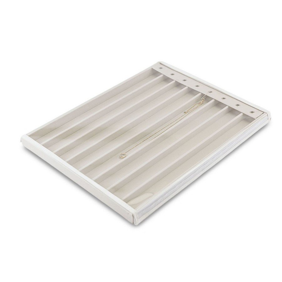 - Composta por 8 suportes dedicados a gargantilhas ou pulseiras, esta bandeja proporciona uma organização eficiente e esteticamente agradável para suas peças, tornando-as facilmente acessíveis para clientes e expositores.