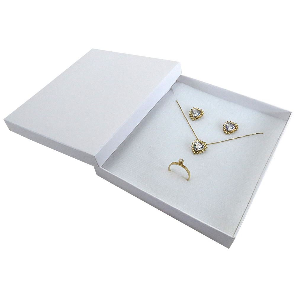 - Material Resistente: Feita com papel consistente que garante a firmeza do produto, esta embalagem oferece proteção e durabilidade para suas joias.