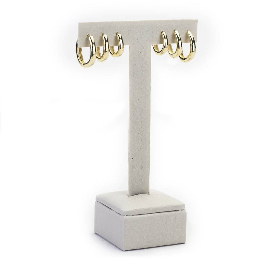 Design: Formato de "T" que proporciona uma exibição vertical e destacada dos brincos, três furos bem posicionados para acomodar e exibir diferentes estilos de brincos.