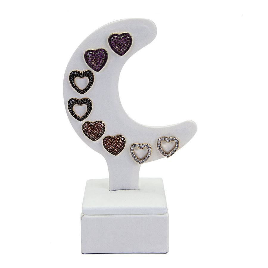 Design em Meia Lua: Este formato exclusivo proporciona uma visualização única e atraente, ideal para exibir piercings e brincos de maneira equilibrada e organizada.