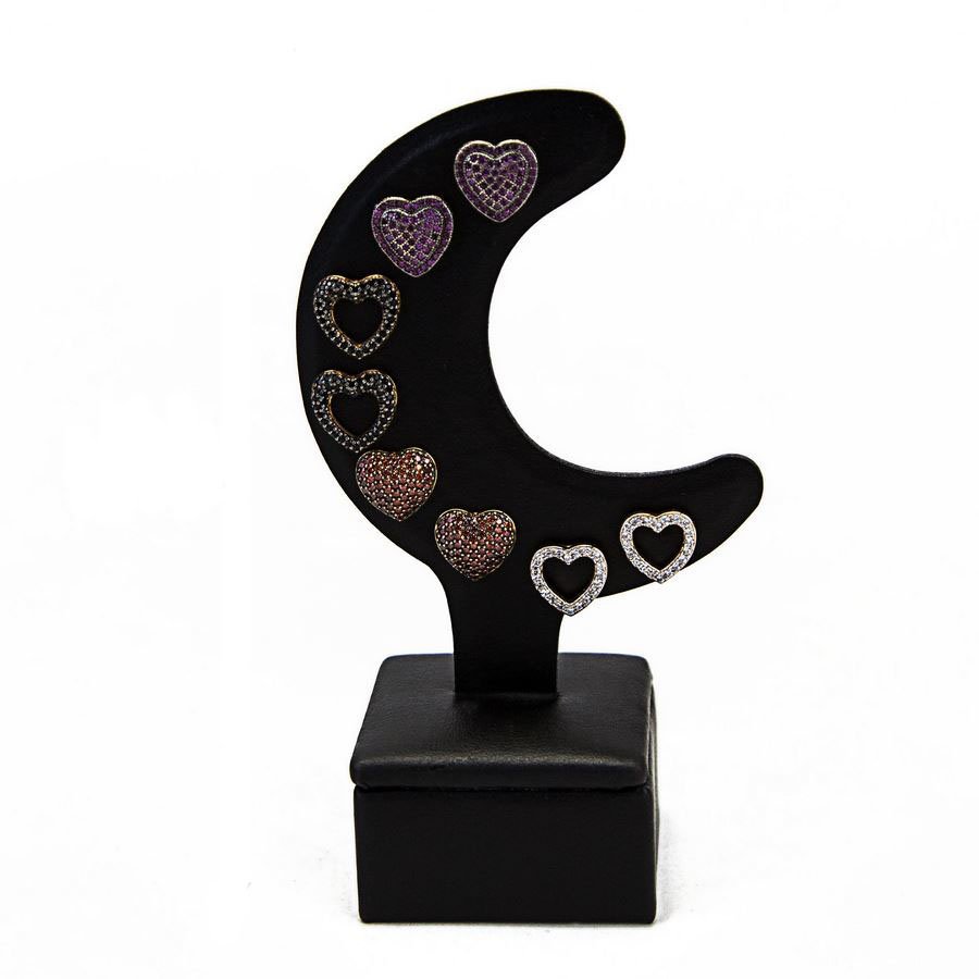 Design em Meia Lua: Este formato exclusivo proporciona uma visualização única e atraente, ideal para exibir piercings e brincos de maneira equilibrada e organizada.