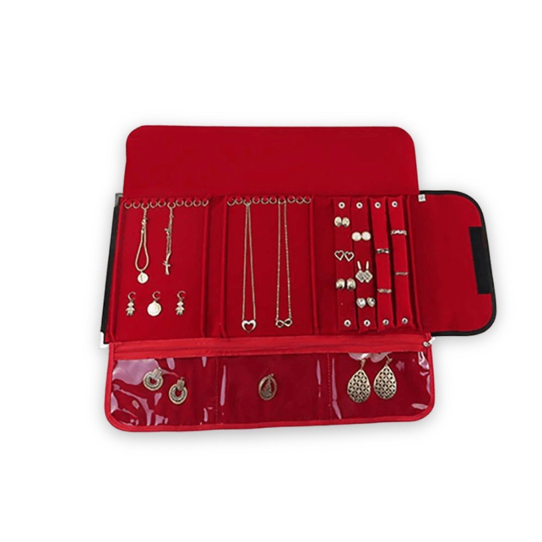 2 Suporte para brincos que comporta até 18 pares, 20 argolas para correntes e/ou pulseiras, 3 argolas para pingentes e 2 suporte para anéis. Possui 3 bolsos.
