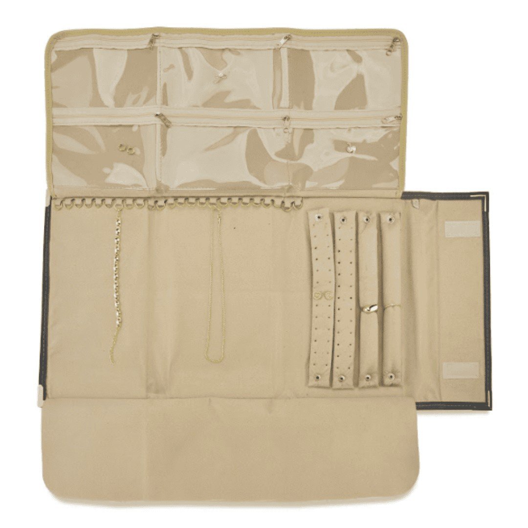 2 Suporte para brincos que comporta até 26 pares, 21 argolas para correntes e/ou pulseiras, 2 suportes para anéis. Possui 6 bolsos.