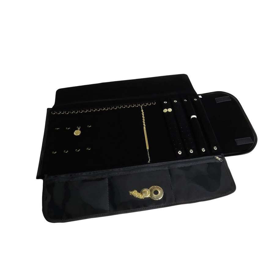 2 Suporte para brincos que comporta até 26 pares, 24 argolas para correntes e/ou pulseiras, 2 suporte para anéis e 8 argolas para pingentes. Possui 3 bolsos.