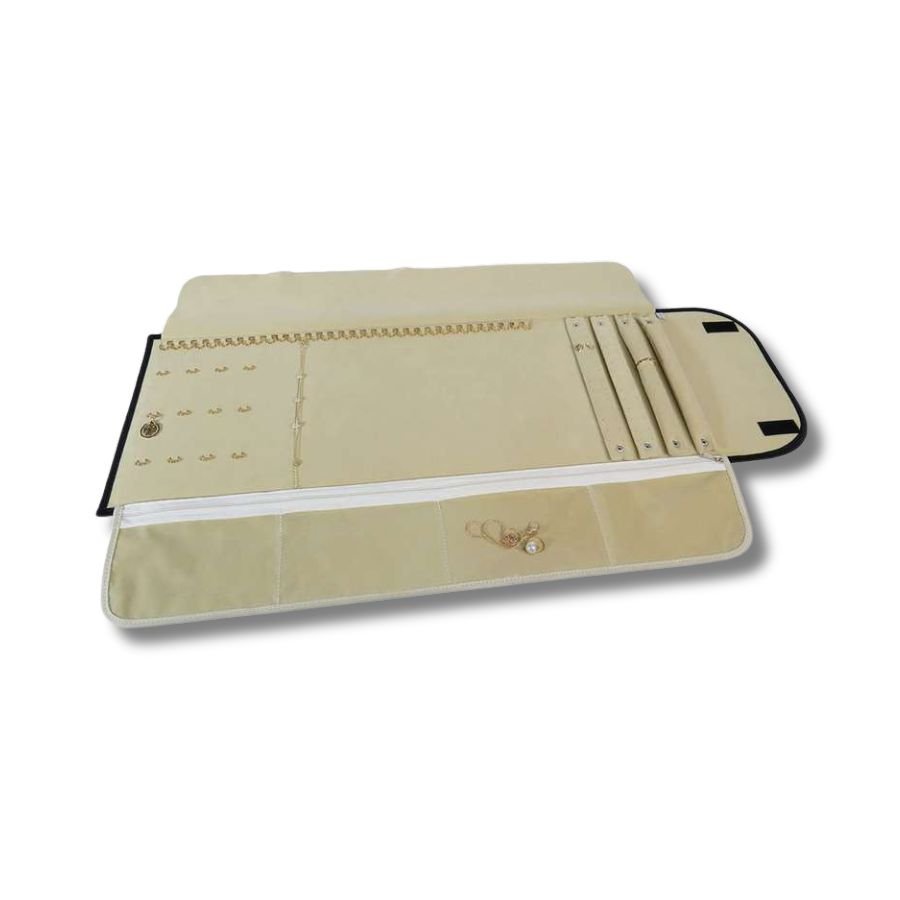 2 Suporte para brincos que comporta até 26 pares, 34 argolas para correntes e/ou pulseiras, 2 suporte para anéis e 12 argolas para pingentes. Possui 4 bolsos.