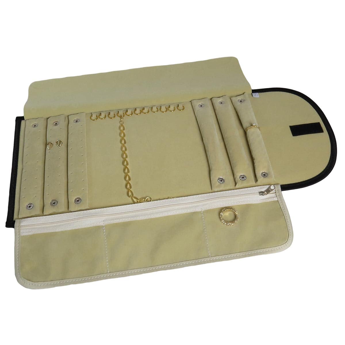 3 Suporte para brincos que comporta até 27 pares, 11 argolas para correntes e/ou pulseiras, 3 suporte para anéis. Possui 3 bolsos.